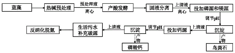 一種用于反硝化外加碳源的制備方法和應(yīng)用,具體涉及一種回收藍藻厭氧發(fā)酵液中氮磷后作為外加碳源的技術(shù),屬于固體有機廢物的處理與利用和水處理技術(shù)領(lǐng)域。